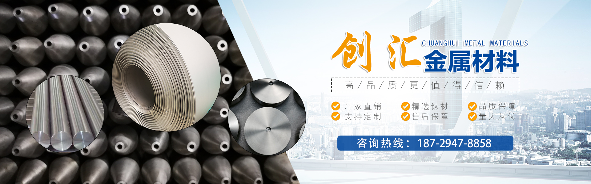 寶雞市創(chuàng)匯金屬材料有限公司,位于有“中國鈦谷”之稱寶雞寶鈦路南段,這里也是國家重點支持和扶持的有色金屬材料資源產業基地,我司專業從事鈦、鋯、鉿、鎳鉻、鎢鉬、鉭鈮、合金材料、復合材料,板、棒、絲、管、箔材等,設備制造,金屬制品機械加工銷售。